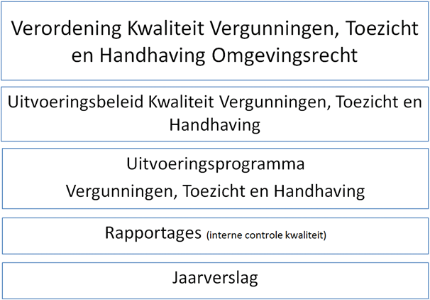 Op grond van de artikelen 5.4 en 5.5 van de Wabo heeft de gemeenteraad de Verordening Kwaliteit Vergunningen, Toezicht en Handhaving Omgevingsrecht vastgesteld. Het college heeft op basis van deze verordening bepaald dat de taken op deze vakgebieden op de volgende kwaliteitsniveaus worden uitgevoerd: