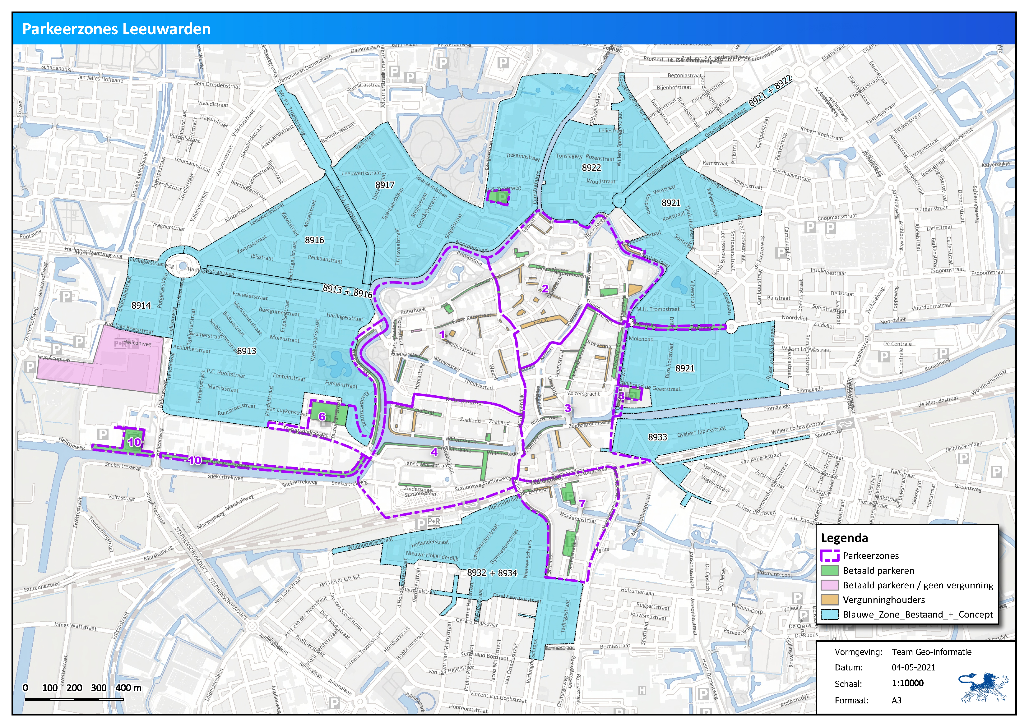Aan te wijzen de zones 1 tot en met 4 en 6 tot en met 10 in Leeuwarden, zoals die zijn aangegeven op de bijgaande kaart volgens Bijlage 2. In deze zones kan met een parkeervergunning worden geparkeerd op parkeerapparatuurplaatsen of op vergunninghoudersplaatsen indien er daartoe een parkeervergunning is verleend overeenkomstig de geldende Parkeerverordening Leeuwarden.