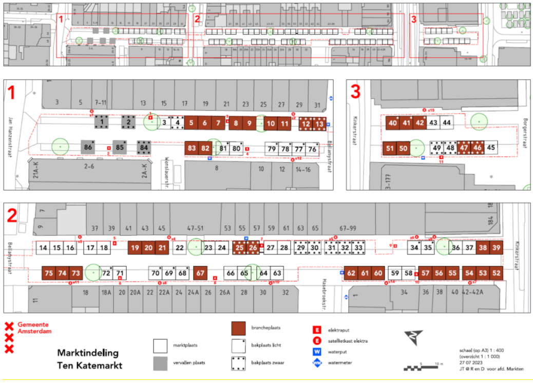 Op de marktplattegrond staan de enkelvoudige marktplaatsen aangeven. In het inrichtingsbesluit wordt het aantal enkelvoudige marktplaatsen op de Ten Katemarkt bepaald op 86. Dit aantal is tot stand gekomen door aanpassingen die de afgelopen jaren op het marktterrein hebben plaatsgevonden. Vanwege de ingang van de Foodhallen zijn de kramen die daar stonden verplaatst. Er is ook een afvaleiland in een bedrijfsruimte achter de markt gekomen, waarvoor er tussen de kramen ruimte is gemaakt voor betere toegankelijkheid. Ook de aanwezige bomen en voorzieningen voor de markt, maken een ruimere opzet van de markt noodzakelijk, zeker vanuit veiligheidsoverwegingen.
