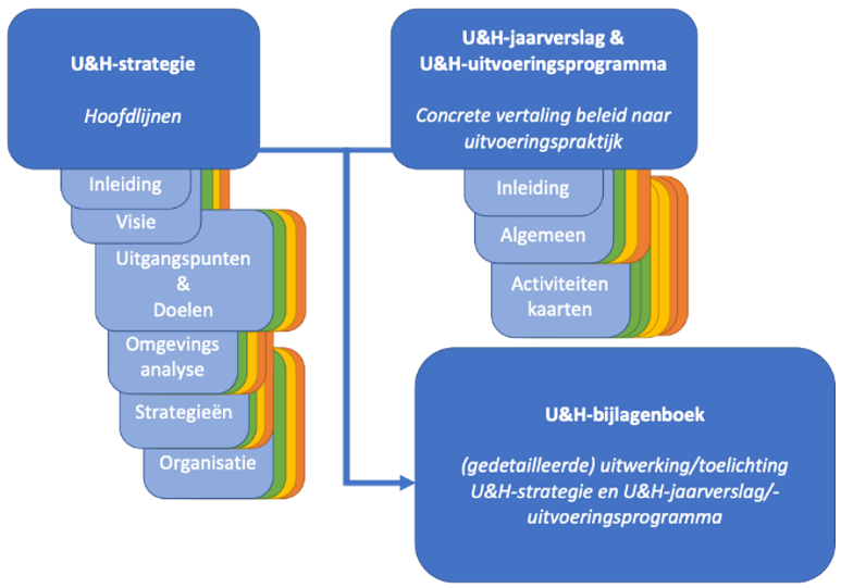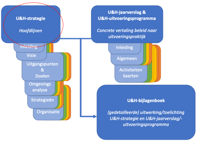 Dit U&H-bijlagenboek is gemaakt om ervoor te zorgen dat de U&H-strategie (weergave op hoofdlijnen) en het U&H-jaarverslag en -uitvoeringsprogramma (weergave van de vertaling van de strategie naar de uitvoeringspraktijk) zo beeldend en bondig mogelijk kunnen blijven. Dit draagt bij aan de vergroten van de leesbaarheid en praktische toepasbaarheid van deze documenten. In dit U&H-bijlagenboek worden de U&H-strategie en het U&H-jaarverslag en -uitvoeringsprogramma nader toegelicht en verder uitgewerkt. Zie ook figuur 2.)