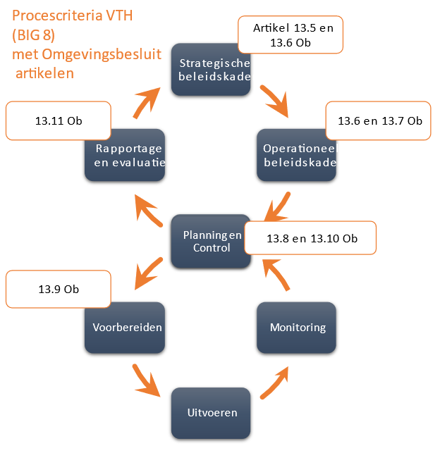 De Uitvoerings- en Handhavingsstrategie (U&H-strategie), het U&H-jaarverslag, het U&H-uitvoeringsprogramma en het U&H-bijlagenboek zijn documenten die wij inzetten om invulling te geven aan de wettelijk verplichte beleids- en uitvoeringscyclus, de zogenoemde Big-8 (zie afbeelding, figuur 1. Deze is hiernaast weergegeven met verwijzing naar de betreffende wetsartikelen uit het Omgevingsbesluit).