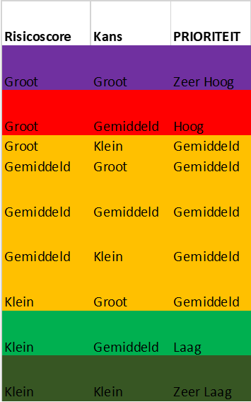 Aan de hand van de weging is per activiteit de ‘Risicoscore’ bepaald. Deze risicoscore geeft per activiteit aan of het negatieve effect Groot,Gemiddeld of Klein is. Vervolgens is afgewogen wat de kans zou zijn op een overtreding op het moment dat wij onze U&H-taken niet zouden uitvoeren. Ook hiervoor is per activiteit een afweging gemaakt of deze Groot, Gemiddeld of Klein is. De afweging van het negatieve effect x de kans heeft uiteindelijk geleid tot een ‘prioriteit’ van Zeer Hoog, Hoog, Gemiddeld, Laag of Zeer Laag (zie afbeelding hiernaast, figuur 6).