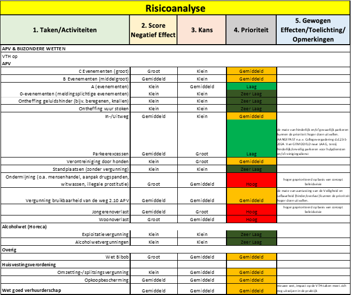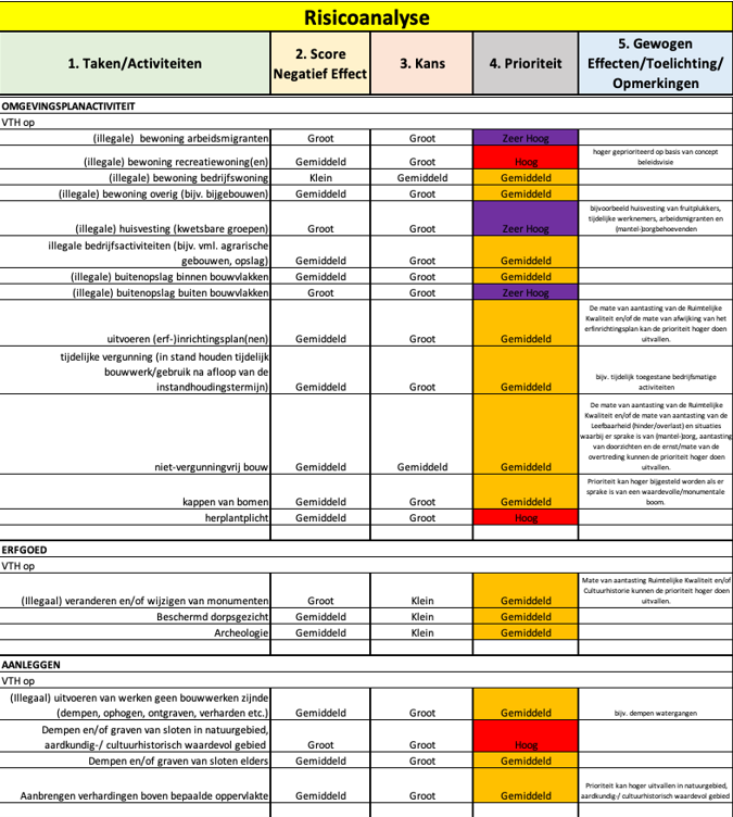 Het toekennen van prioriteiten geeft richting aan de taakuitvoering door VTH en maakt deze meer risicogestuurd. Tegelijkertijd is duidelijk dat dit niet betekent dat andere taken niet meer worden uitgevoerd of tegen andere overtredingen van regels die zich voordoen niet meer wordt opgetreden. Wel leiden prioriteiten ertoe dat er een volgorde in handelen wordt aangebracht. Doen de risico’s zich voor die hier zijn benoemd dan worden deze als eerste opgepakt.