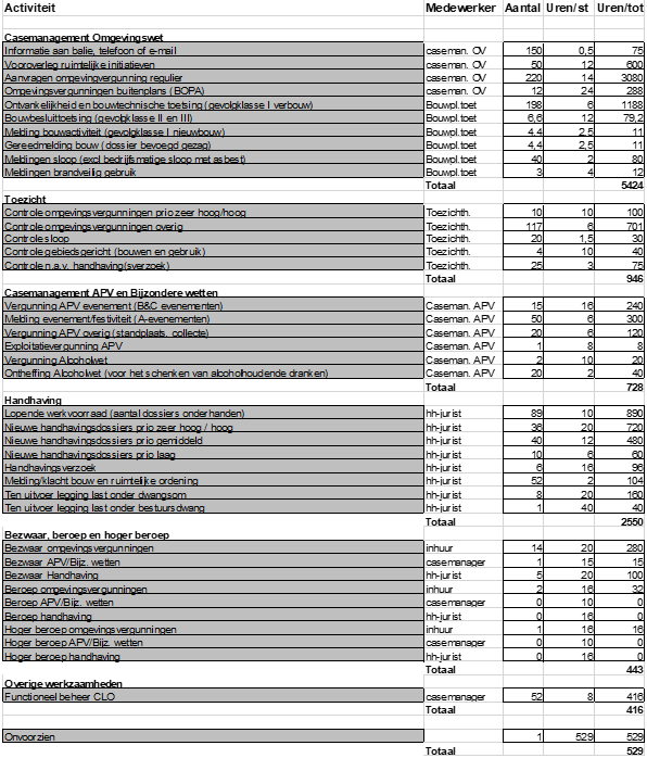 Toezichthouder – 1fte: het toezichthouden op de bouwkwaliteit en op het naleven van de bouwregelgeving (Ow, Bbl en/of Wkb) op de bouwplaats en bebouwde omgeving (bouwhandhaving). Onder handhaving wordt hier verstaan het stilleggen van, niet conform de wet- en regelgeving uitgevoerde werkzaamheden, het signaleren en rapporteren van illegale bouw (zonder vergunning) en/of het bouwen in strijd met de afgegeven vergunning, toezicht bestaande bouw, toezicht op strijdige gebruikssituaties.